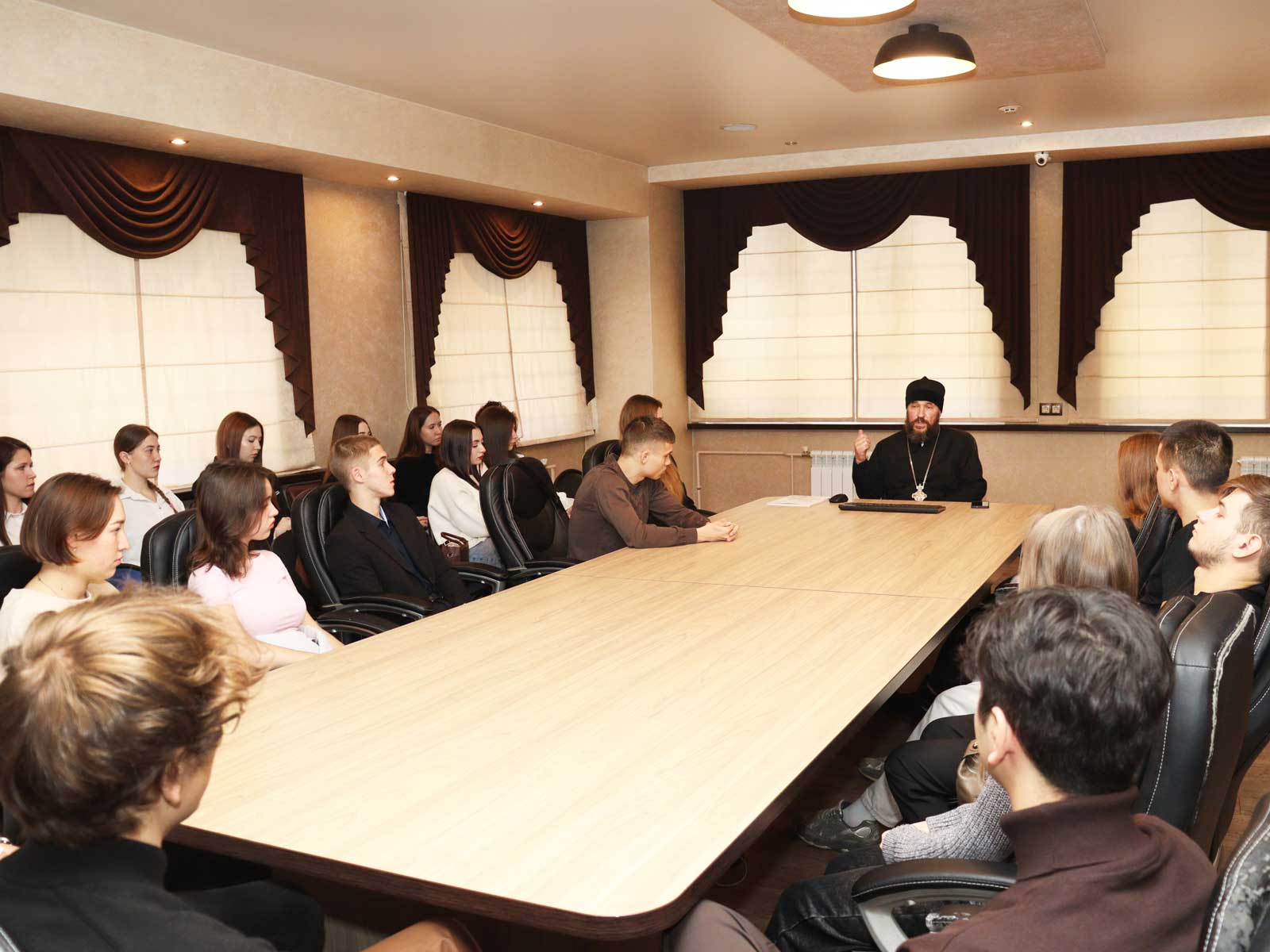 Настоятель Михайло-Архангельского (Харлампиевского) храма Евгений Старцев – частый гость в вузах, школах города и СМИ. Его приглашают на встречи с сотрудниками правоохранительных органов. А сегодня он спикер Байкальского госуниверситета. На встречу с ним пришли студенты разных институтов 1 и 2 курса.