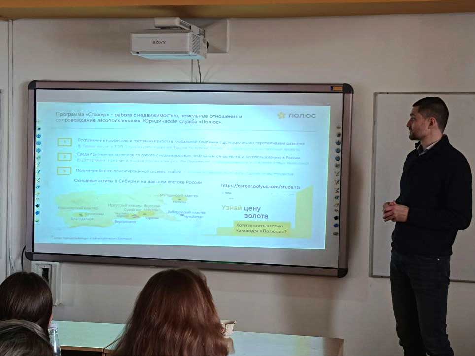 Игру-квиз, связанную с тестированием знаний по вопросам правовых отношений в сфере земли, недвижимости и отведения лесных угодий для студентов БГУ провели представители компании «Полюс». Начальник одного из отделов предприятия Лев Ашуркин пояснил, что таким образом выясняется уровень подготовки студентов и отбираются претенденты для участия в программе «Стажёр». Ребята старших курсов вузов Иркутска показавшие лучшие результаты смогут стажироваться в компании в течение полугода, получая при этом заработную плату.