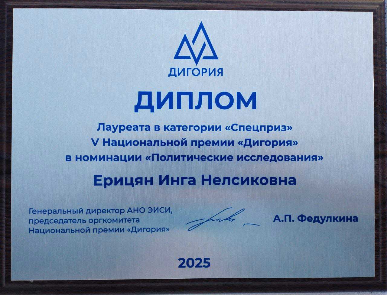 Проект старшего преподавателя кафедры международных отношений и таможенного дела Инги Ерицян «Политика России в отношении де-факто государств постсоветского пространства» был отмечен Экспертным советом Национальной Премии «Дигория». По его решению Инге Нелсиковне было присвоено звание лауреата в номинации «Политические исследования».