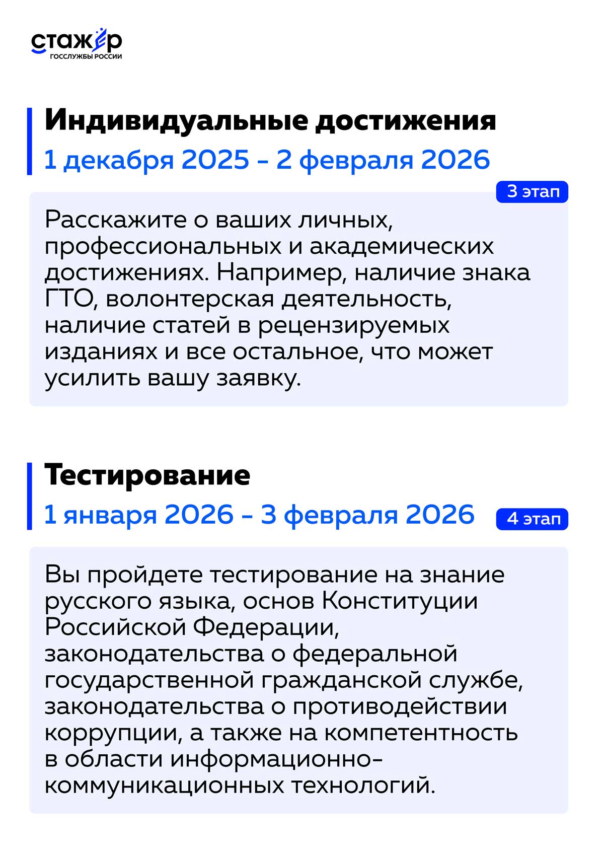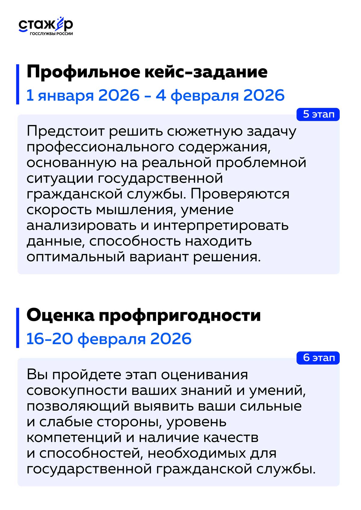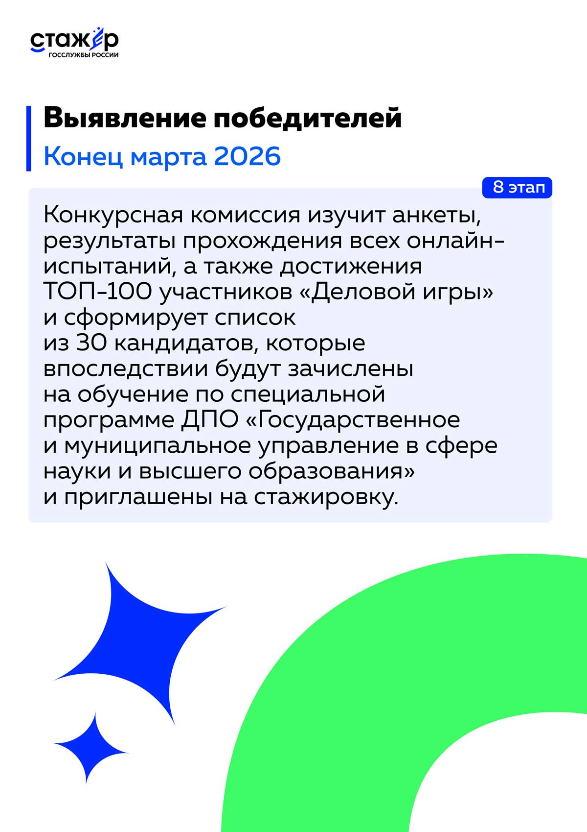 Минобрнауки России объявило о запуске 4-го сезона проекта «Стажёр госслужбы России» для отбора молодых специалистов на госслужбу. Участникам предстоит пройти онлайн-этапы отбора, а ТОП-100 из них — поучаствовать в очной деловой игре.