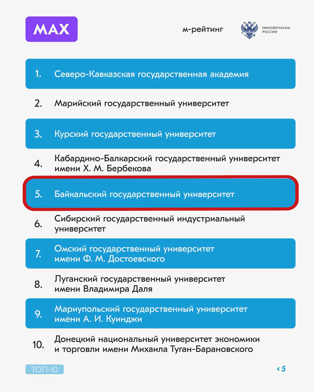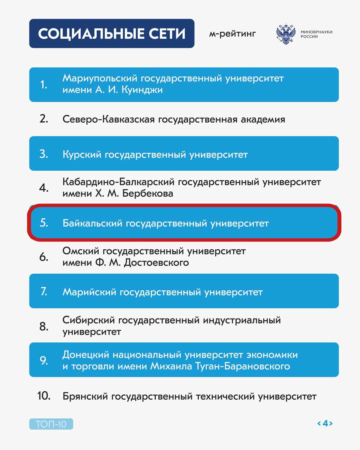 Вышел очередной рейтинг медийной активности российских вузов от Минобрнауки за январь. Университет занял 5 позицию по активности в социальных сетях среди всех вузов. Также высокий показатель работы в МАХ - 5 место по стране. В ВК и ТГ позиции БГУ поднялись в два раза. Уверенно держится высокое место у сайта.
