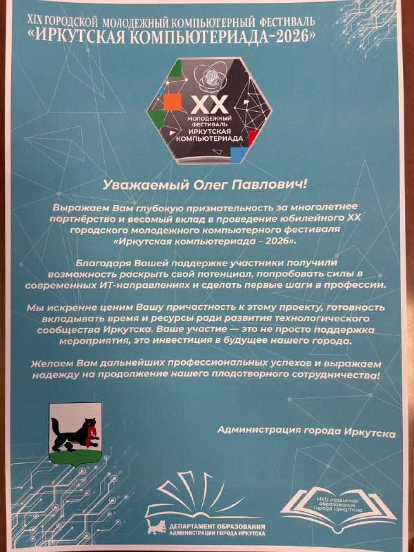 В иркутской школе № 19 состоялась торжественная церемония награждения победителей XX городского молодежного фестиваля «Иркутская компьютериада – 2026». В этом году в нем приняли участие более двух тысяч учащихся муниципальных и частных образовательных учреждений областного центра.