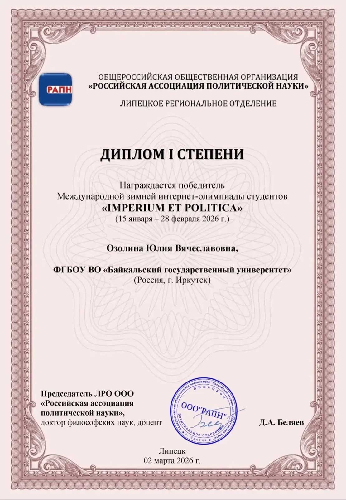 Юлия Озолина - студентка 1 курса Международного факультета БГУ. Нынешняя её награда – диплом I степени в Международной зимней интернет-олимпиаде студентов «IMPERIUM ET POLITICA». Организатором состязаний выступила Российская ассоциация политической науки.