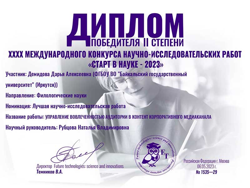 В первой декаде мая в Российском научном обществе были подведены итоги Международного конкурса научно-исследовательских работ «Старт в науке - 2023». Коллективная работа студенток Байкальского государственного университета Евгении Швагрук, Анастасии Ильиной и Дарьи Демидовой на тему «Управление вовлеченностью аудитории в контент корпоративного медиаканала» была отмечена Дипломом II степени по направлению филологические науки.