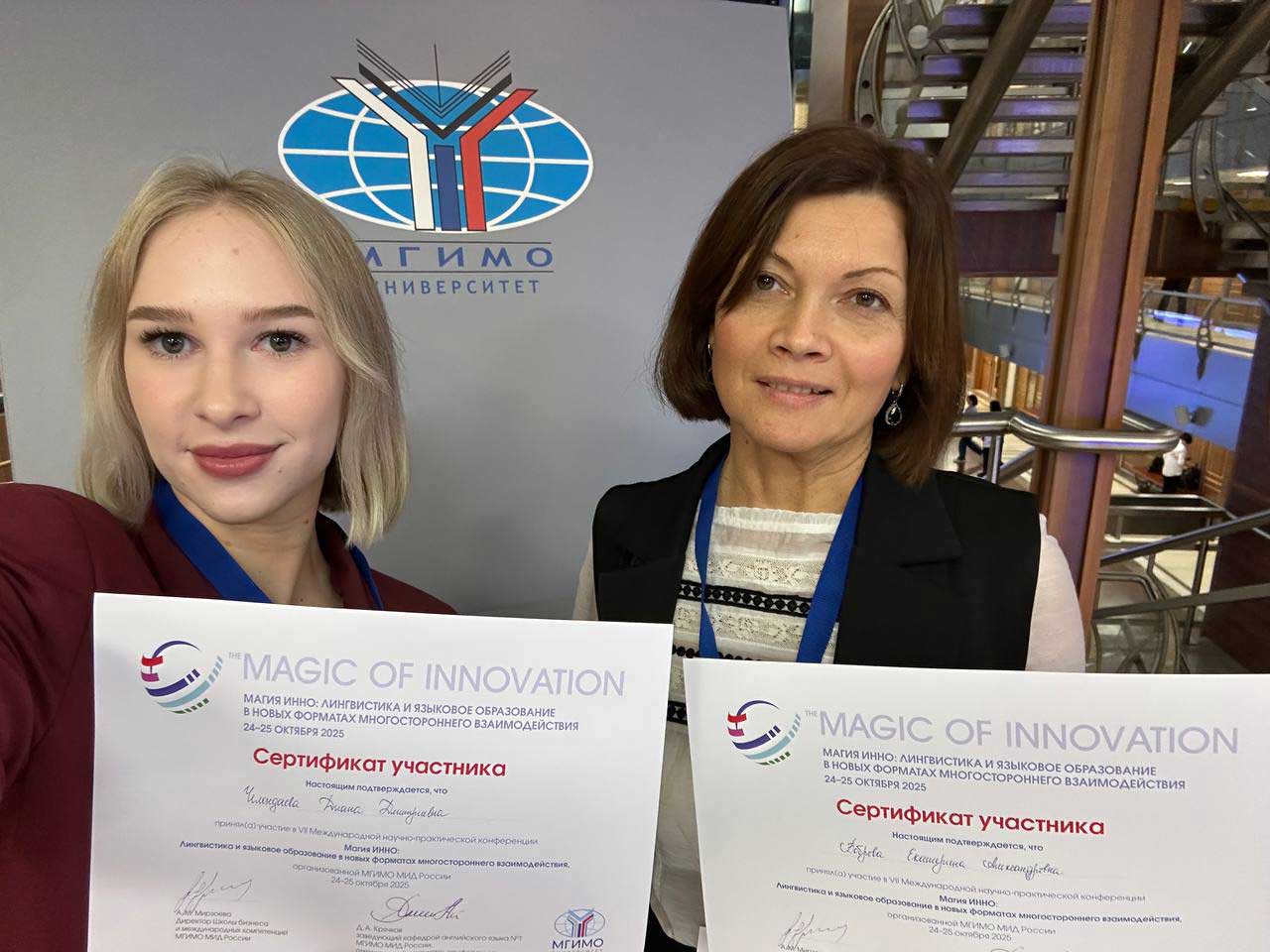 Magistrant of the Institute of World Economy and International Relations of BSU Diana Chelondaeva and associate professor of the Department of Theoretical and Applied Linguistics Ekaterina Bobrova took part in the International Scientific and Practical Conference "INNO Magic." The event was held on the basis of the Moscow State Institute of International Relations (MGIMO) of the Russian Foreign Ministry.