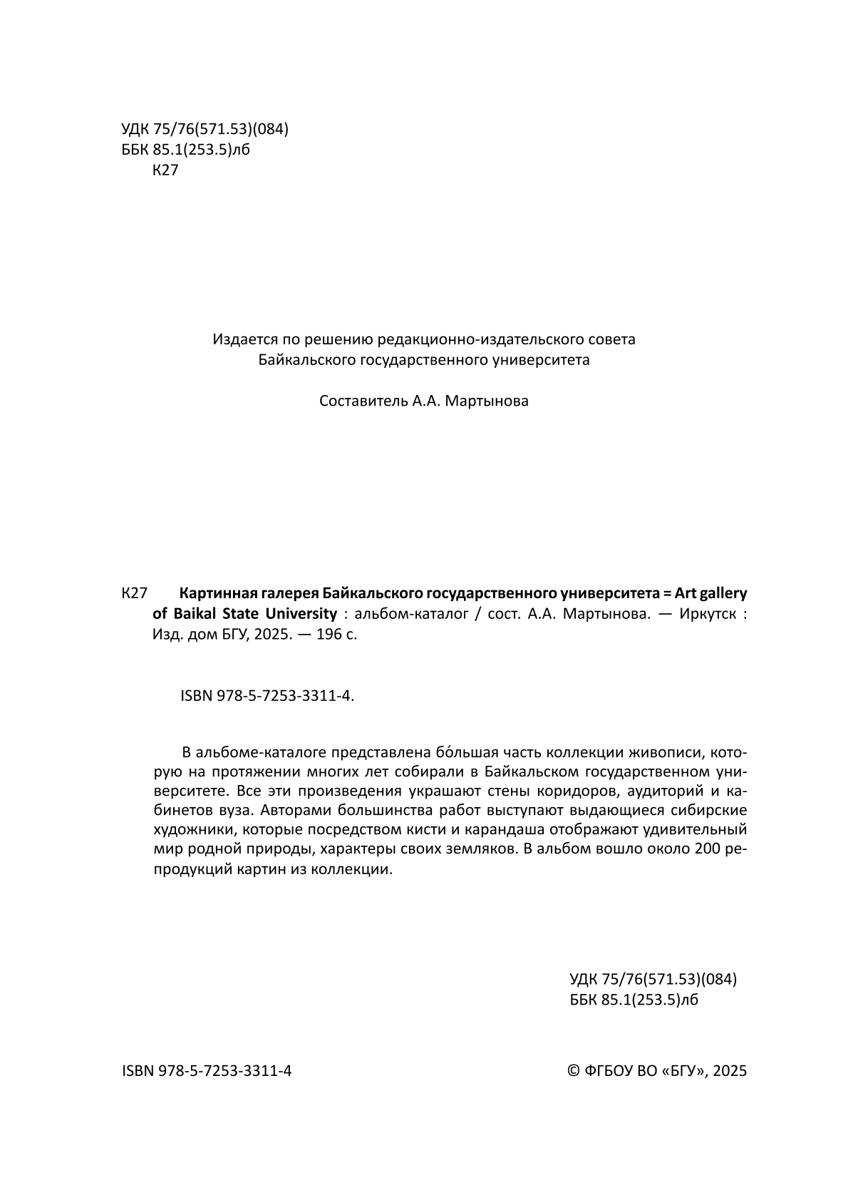 В альбоме-каталоге представлена бо́льшая часть коллекции живописи, которую на протяжении многих лет собирали в Байкальском государственном университете.