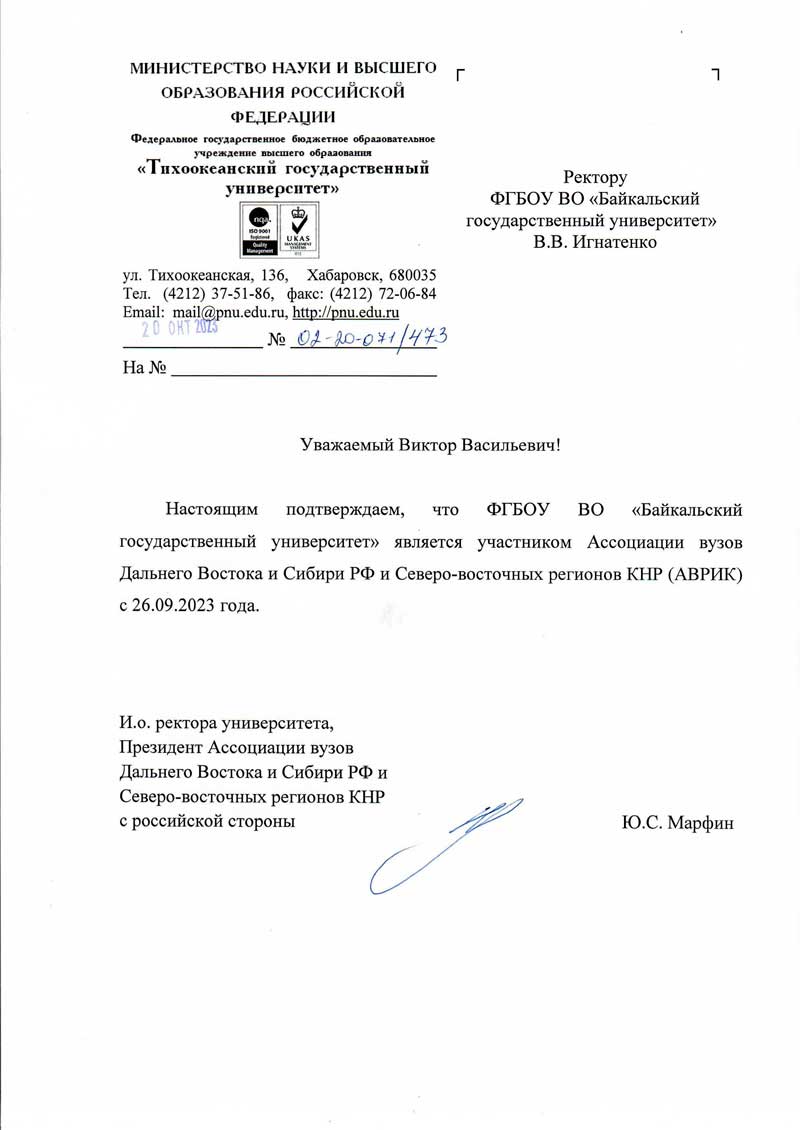 В рамках ежегодного собрания членов Ассоциации вузов Дальнего Востока, Сибири России и Северо-Восточных регионов КНР (АВРИК) было принято решение о вхождении Байкальского государственного университета в состав ассоциации от Иркутской области.