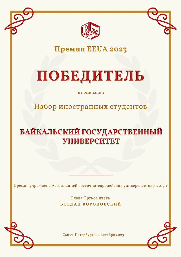Ассоциация восточно-европейских университетов (EEUA), которая была образована в 2017 году, присудила Байкальскому государственному университету премию в области набора иностранных студентов. Об этом сообщил сегодня ректор Байкальского госуниверситета, профессор Виктор Игнатенко на заседании ученого совета вуза.