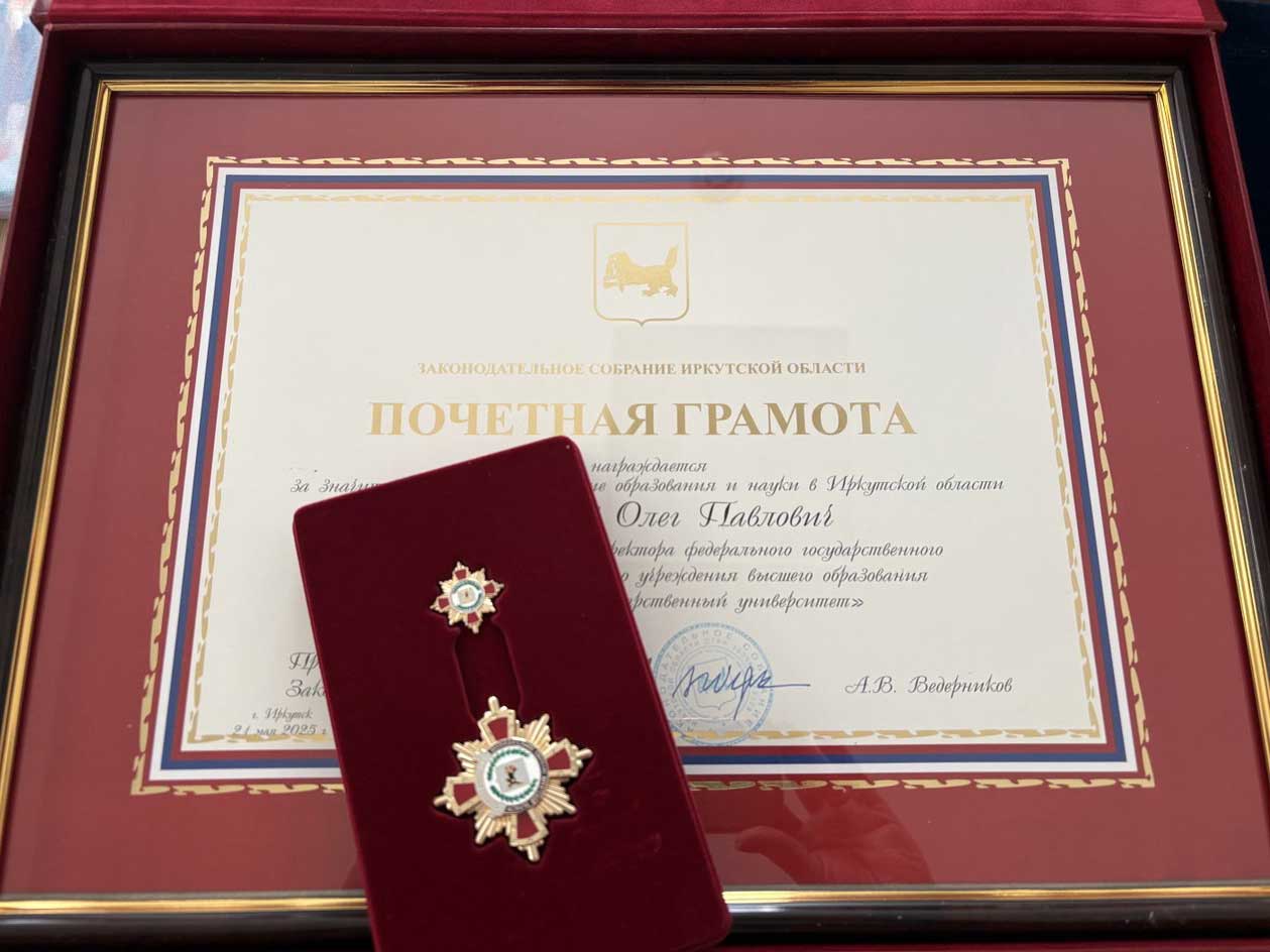 На 28-й сессии областного Парламента ректору Байкальского госуниверситета Олегу Грибунову была вручена Почётная грамота Законодательного Собрания Иркутской области и знак. Передал награду председатель Парламента Александр Ведерников. Он пояснил, что Олег Павлович отмечен за значительный вклад в развитие образования и науки в Иркутской области.