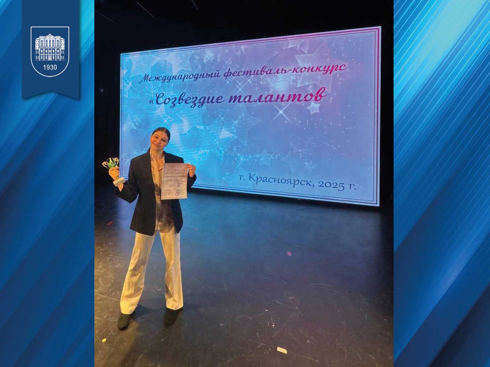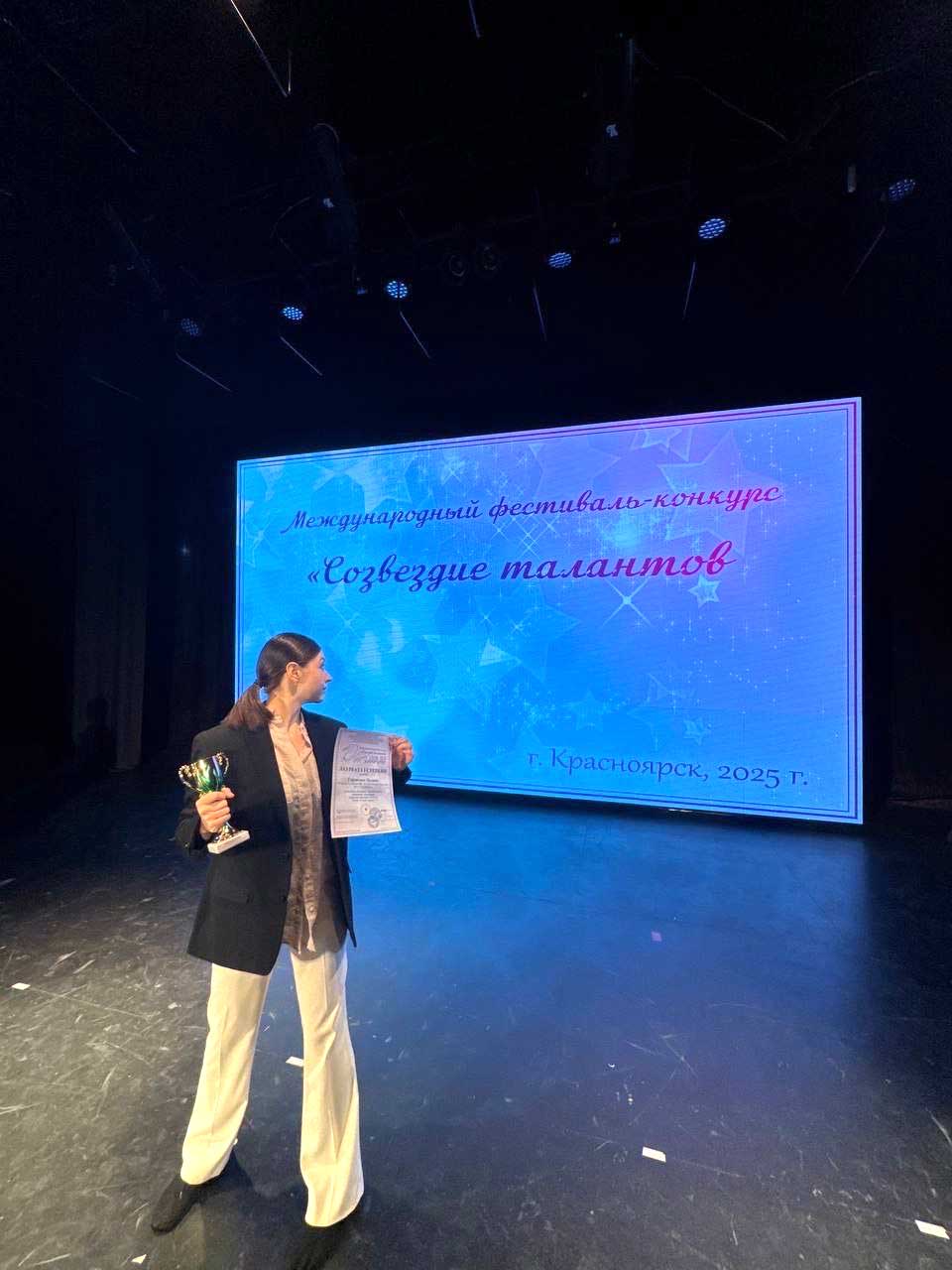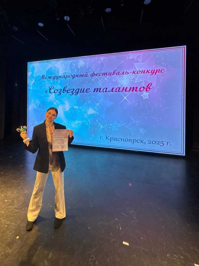 В Красноярске завершился Международный фестиваль-конкурс «Созвездие талантов». Студентка Усть-Илимского филиала БГУ Полина Гордиенко, воспитанница театрального отделения Детской школы искусств №1, стала лауреатом I степени, в номинации хореография, и лауреатом II степени, в номинации художественное слово.