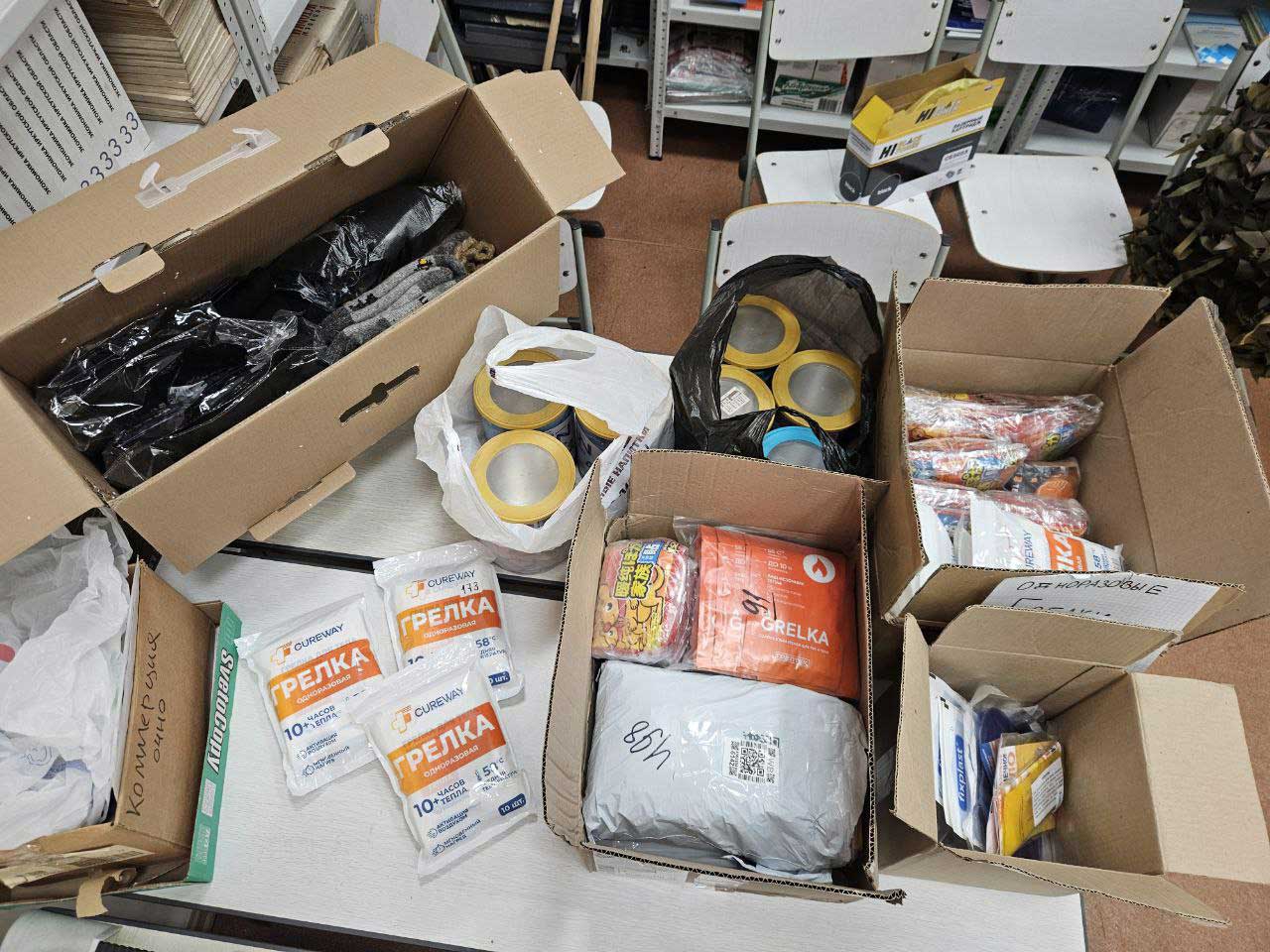 с одноразовыми грелками, тёплыми носками, и большими жестяными банками для