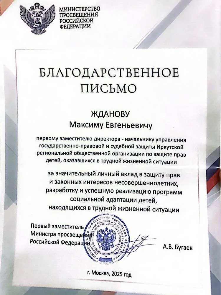 Минпросвещение России отметило Максима за значительный вклад в защиту прав и законных интересов несовершеннолетних, разработку и успешную реализацию программ социальной адаптации детей, находящихся в трудной жизненной ситуации.