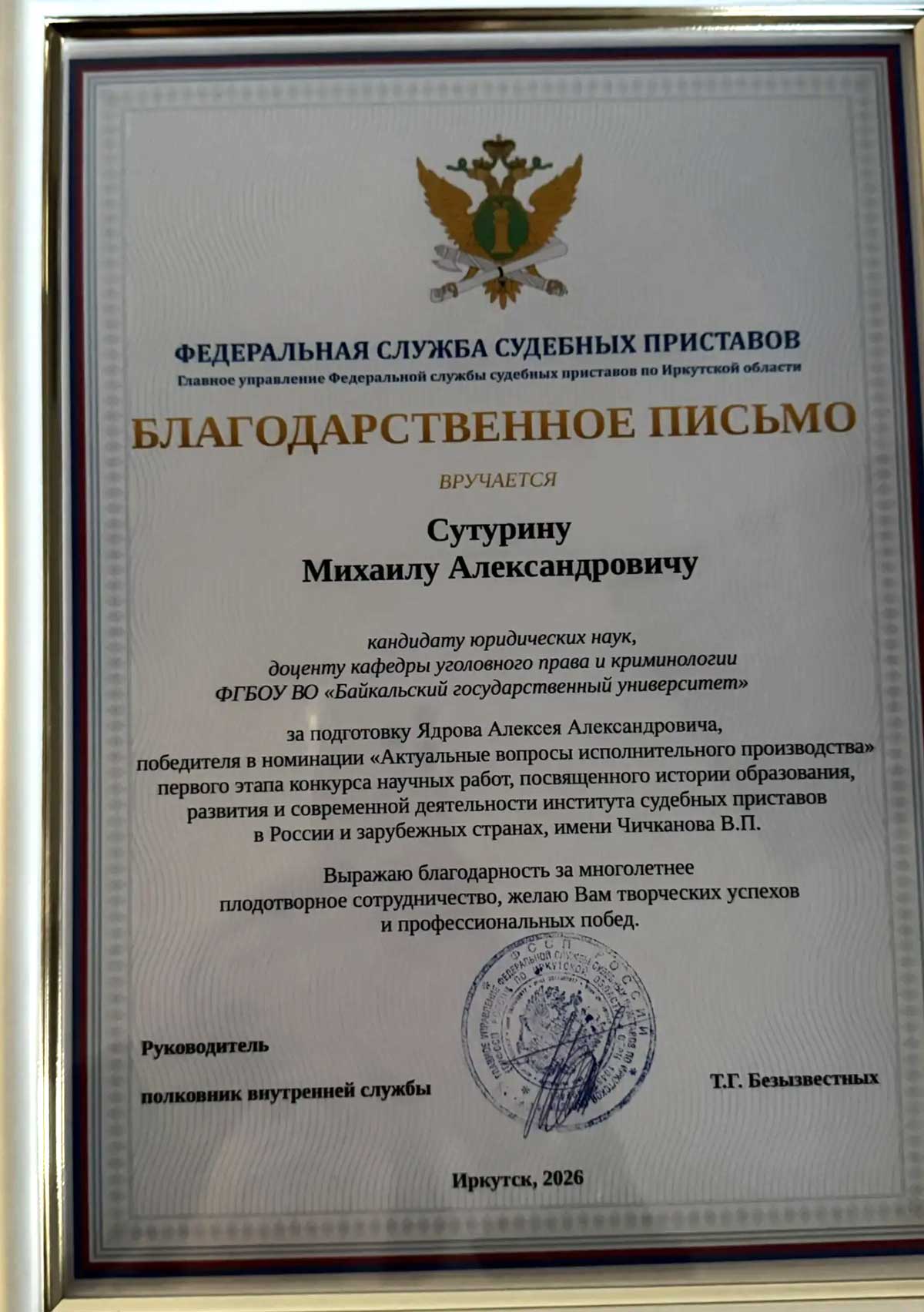 за подписью руководителя ГУ ФССП по Иркутской области полковника внутренней