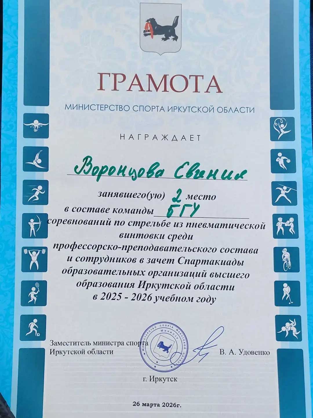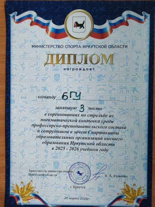 Команда преподавателей и сотрудников БГУ заняла III место в соревнованиях по стрельбе среди вузов Иркутской области. Турнир прошёл на базе ИРНИТУ в рамках Спартакиады образовательных организаций высшего образования 2025–2026 учебного года.