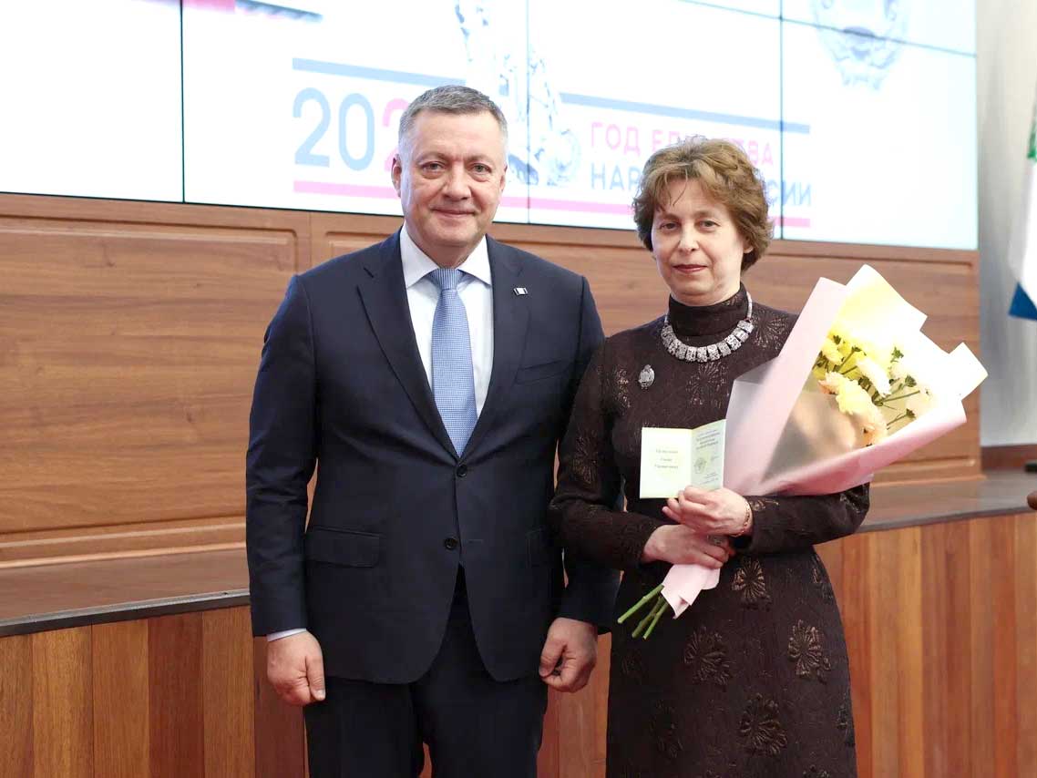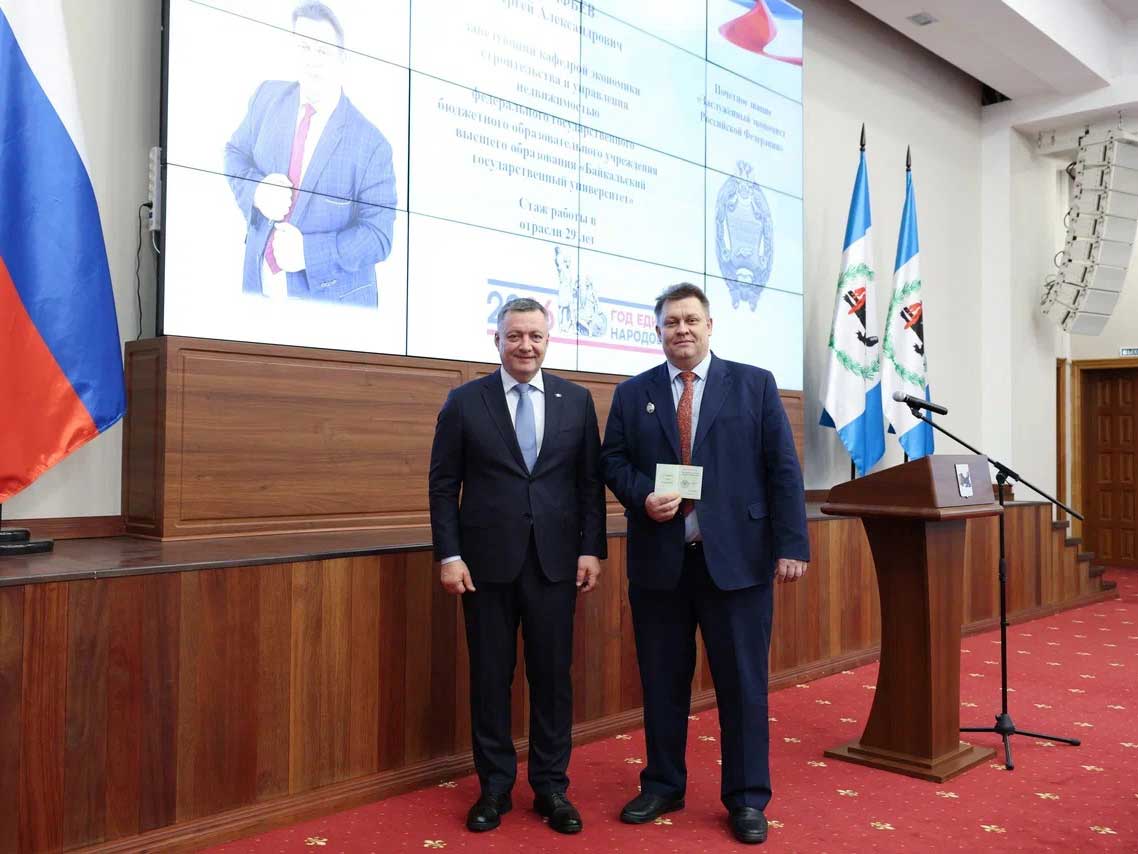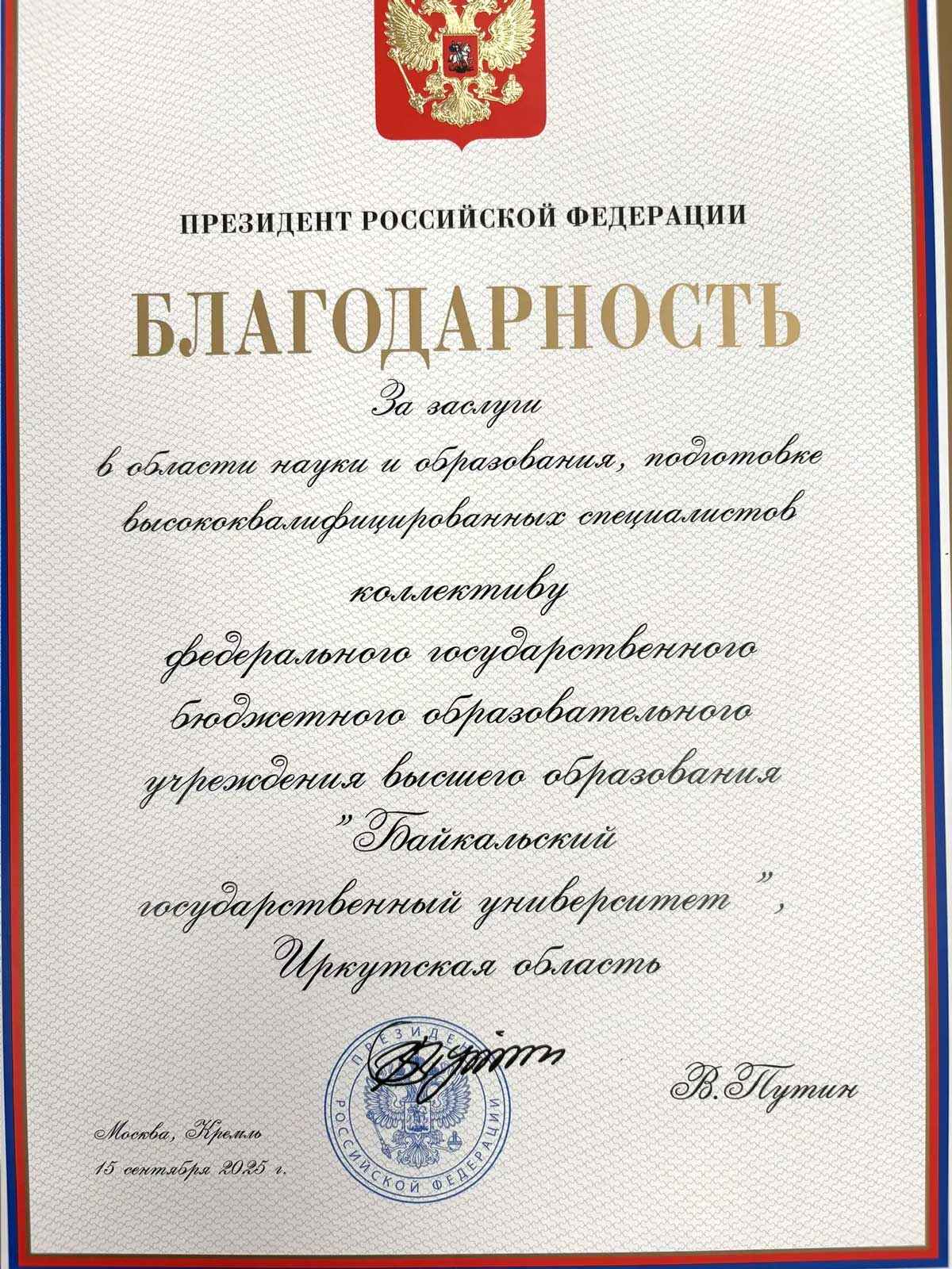 Губернатор Иркутской области Игорь Кобзев вручил ректору Байкальского государственного университета профессору Олегу Грибунову Благодарность Президента России Владимира Путина. Награда присуждена коллективу вуза за заслуги в области науки и образования, а также за вклад в подготовку высококвалифицированных специалистов.