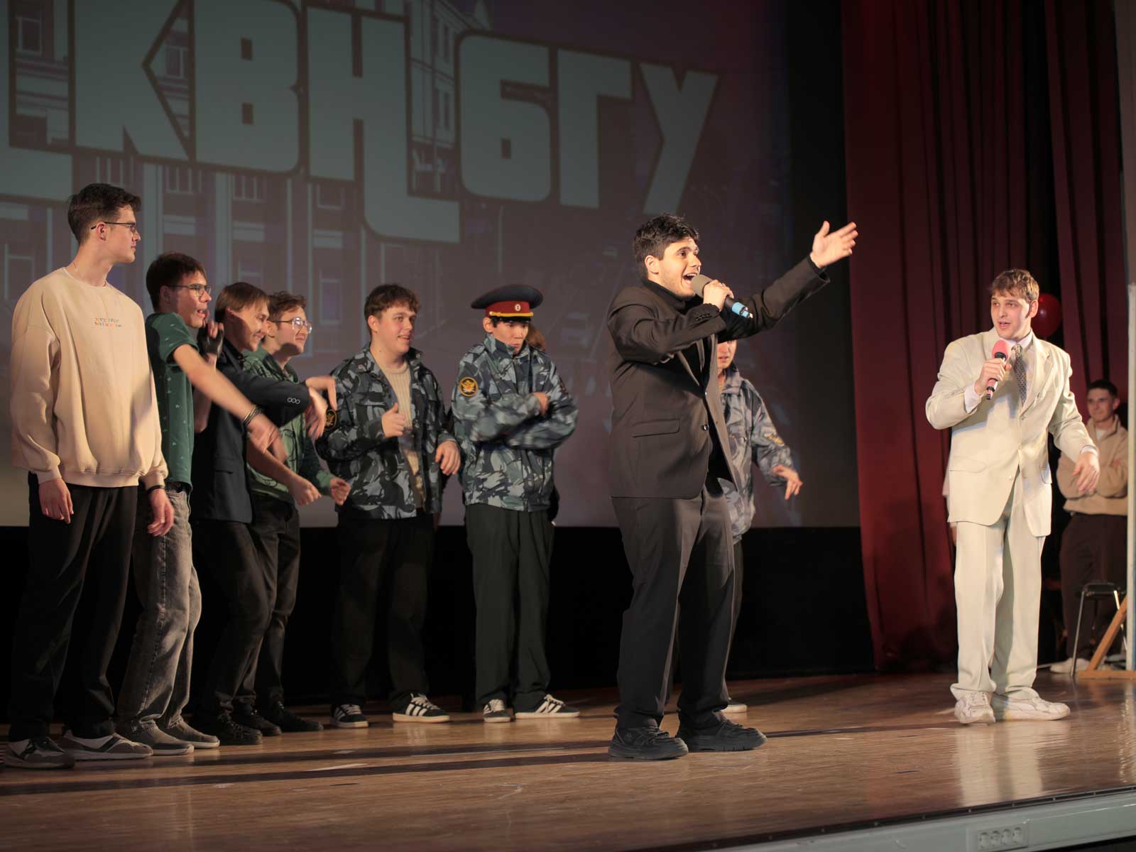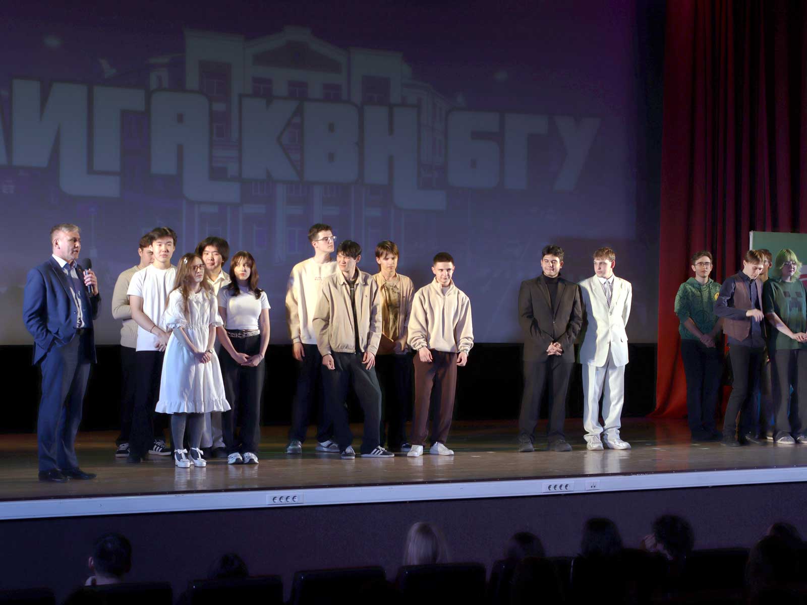 На сцене СКДЦ БГУ «Художественный» накануне вечером было шумно и весело — университет отметил финал сезона Лиги КВН. За главный трофей года боролись четыре команды:
